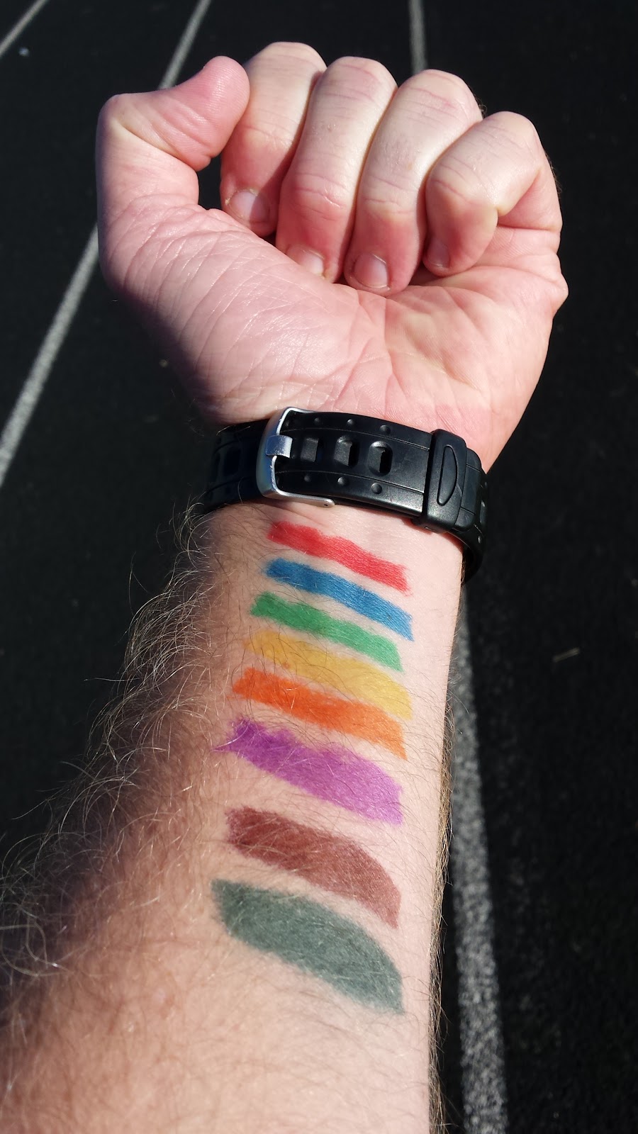 Check out our rainbow run pics as we prepared for the mile run! The rainbow run was a team scavenger hunt to find each color while jogging from one spot to another. Our rainbow run tattoo was 100% washable:).